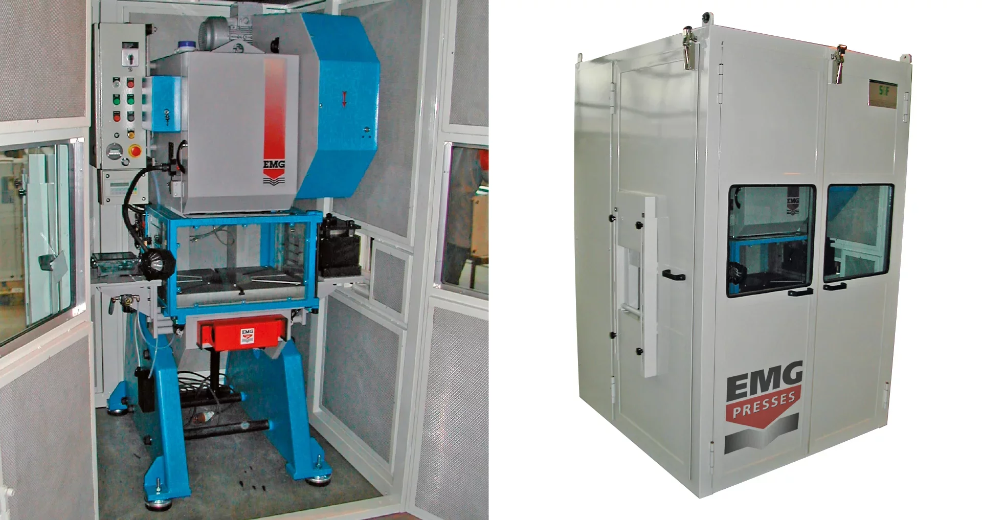 Afin de réduire très efficacement les nuisances dues aux bruits, l'équipement de votre presse par une cabine d'insonorisation permet une réduction du niveau sonore entre 15 et 18 dB. La ventilation est assurée par un ventilateur équipé de silencieux avec un débit de 1500 m3/h. L'accès à la machine est assuré par des portes montées sur charnières sur les faces avant, arrière et latérales. Les cabines sont livrées complètement montées sur palette.